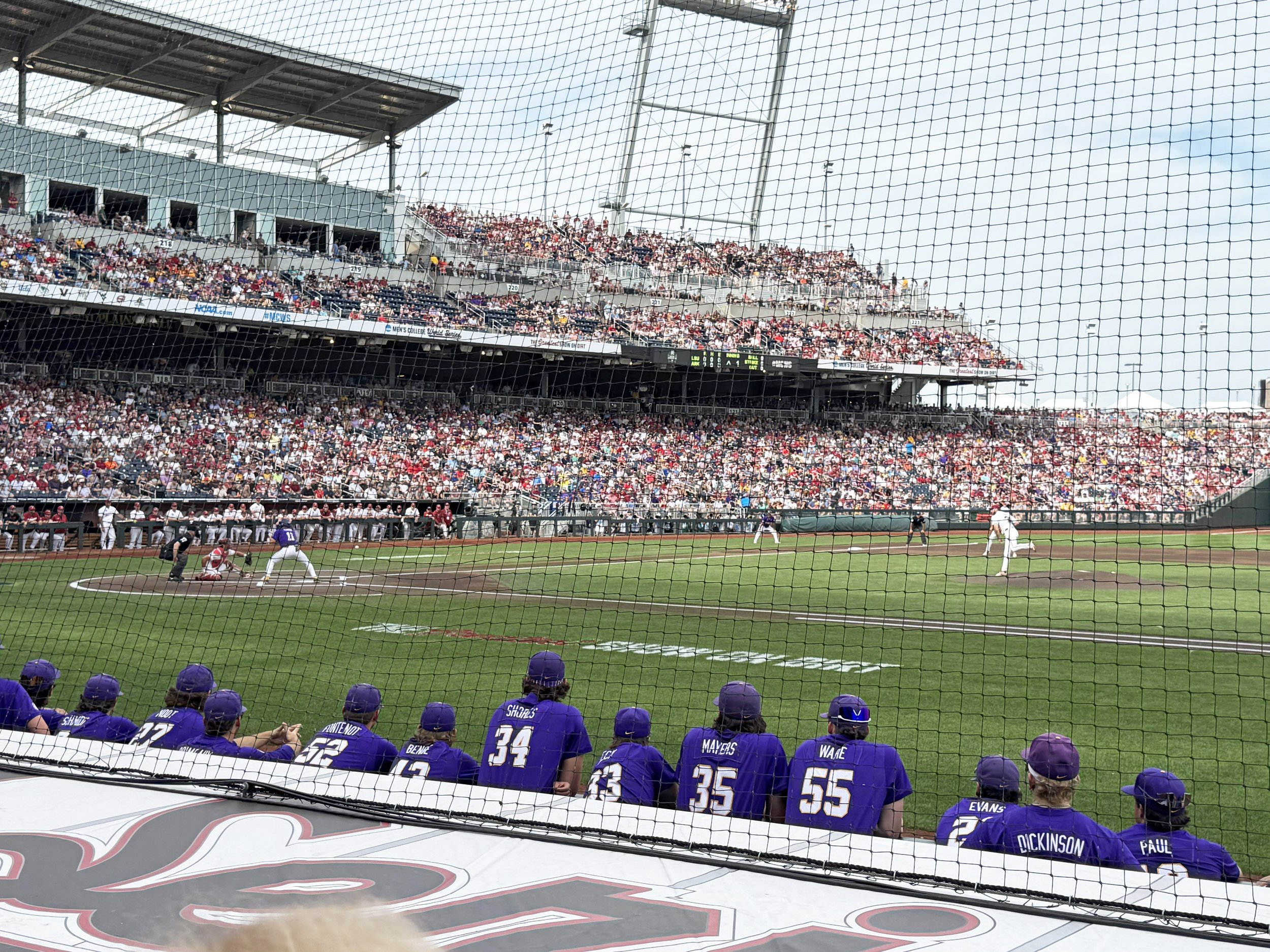 We arrived in Omaha to find an absolute madhouse surrounding Charles Schwab Field. We had anticipated big crowds for a prestigious event like this, held at a sold-out ballpark that seats nearly 25,000. What we had not considered was that, because we were seeing the second of two games on the day, we were approaching the ballpark with 25,000 fans of LSU and Arkansas, while 25,000 fans of UCLA and Murray State from the first game were leaving the ballpark and filling the surrounding streets.