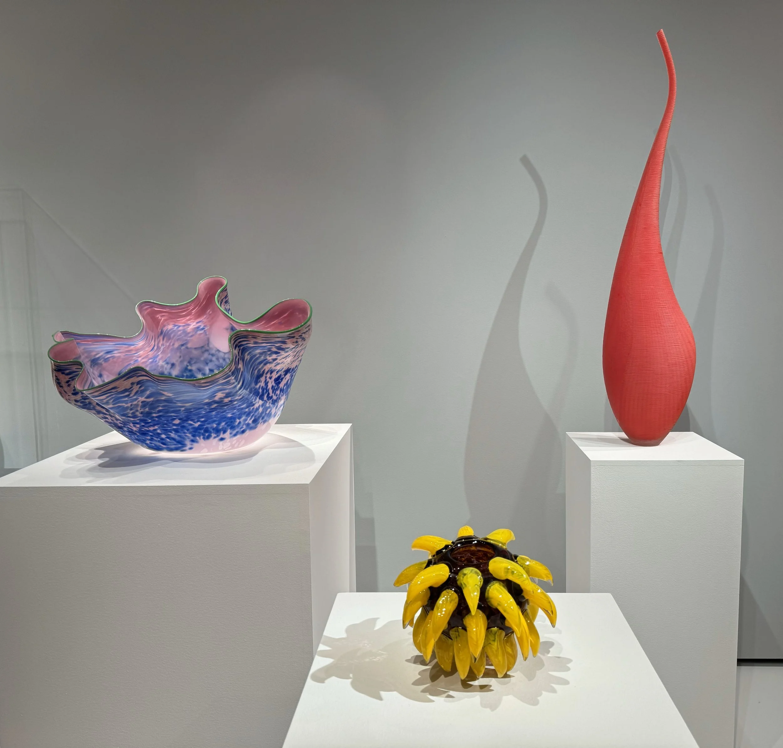 LEFT TO RIGHT: Dale Chihuly, Macchia, 1986. Dale Chiihuly, Deep Violet Venetian with Yellow Prunts, 1991. Lino Tagliapietra, Red Dinosaur, 1990.