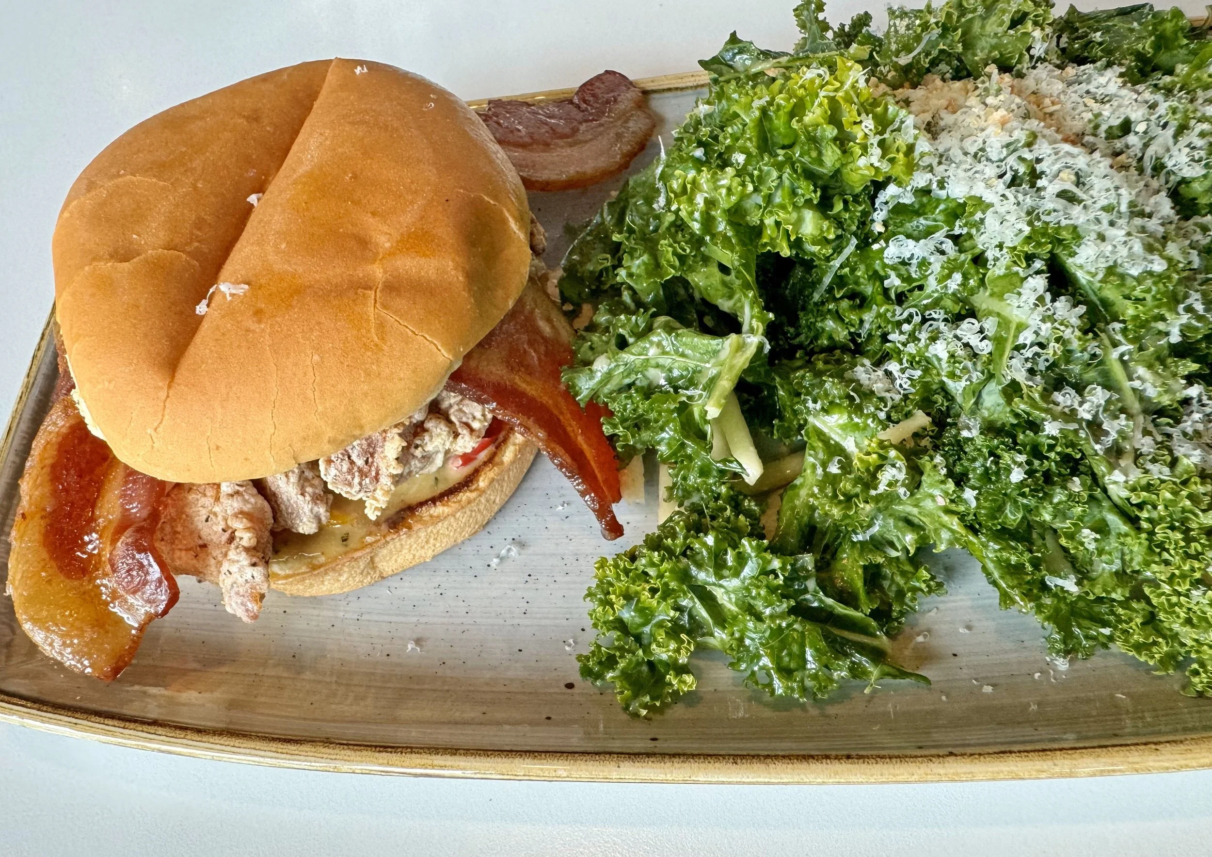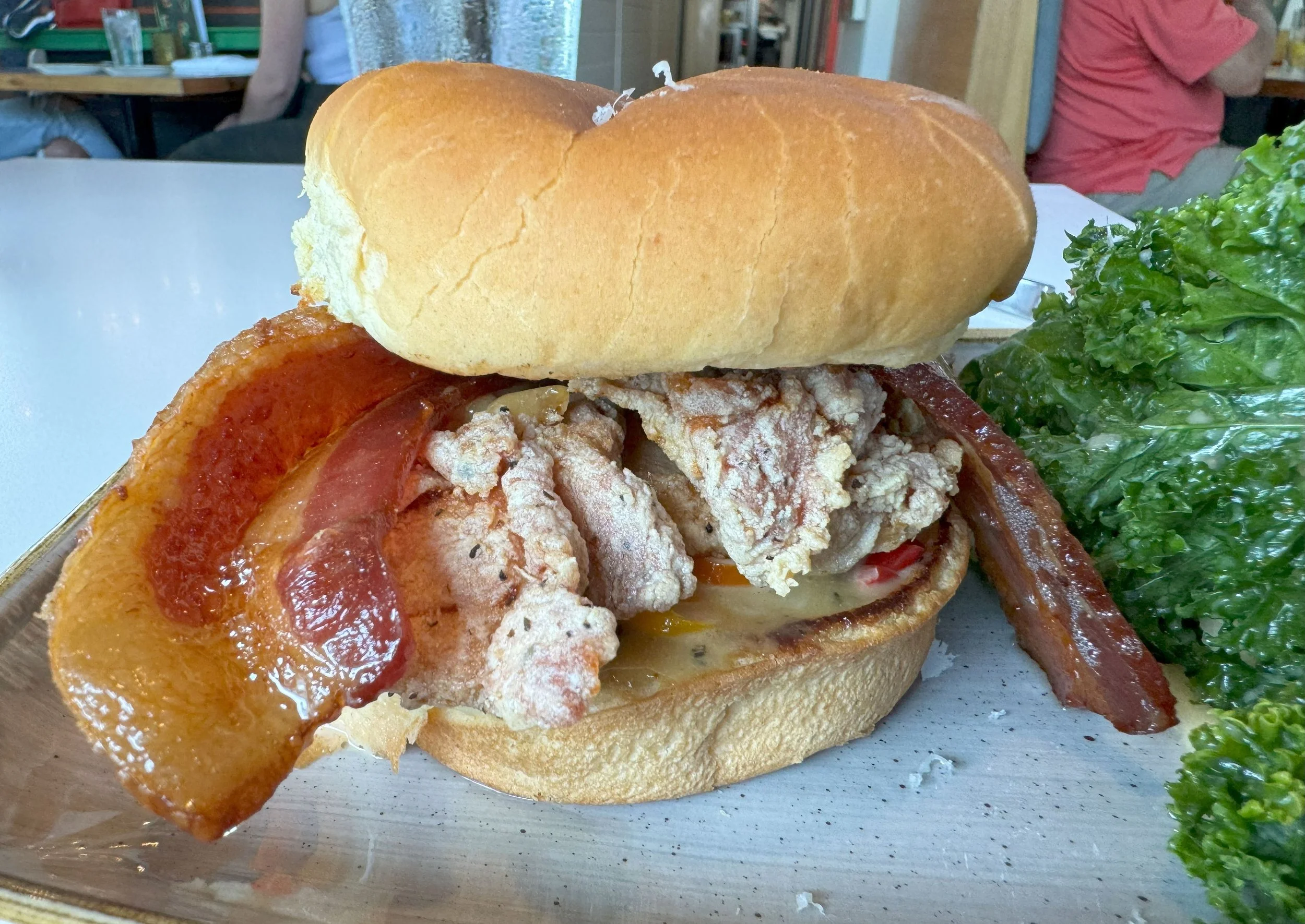 Dad had the Baja fish tacos, which looked incredible. I tried the honey mustard fried chicken sandwich with bacon, which was plenty good if a bit unwieldy. And yeah, I chose a kale salad on purpose and liked it.