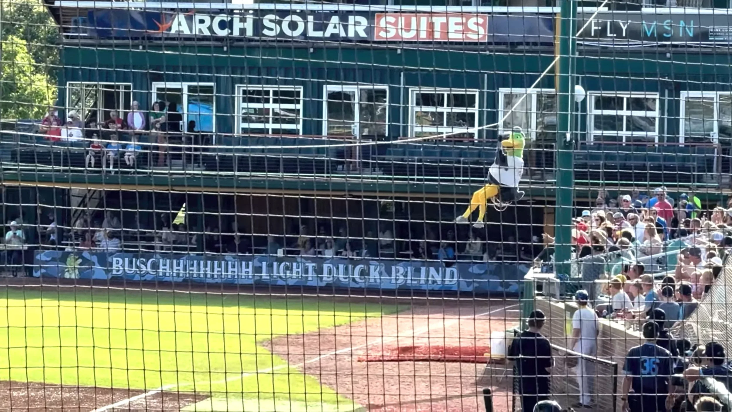 Just before the game began, mascot Maynard arrived, as he always does, on a zipline extending from the right field Duck Blind Club to home plate. (Watch the episode!)