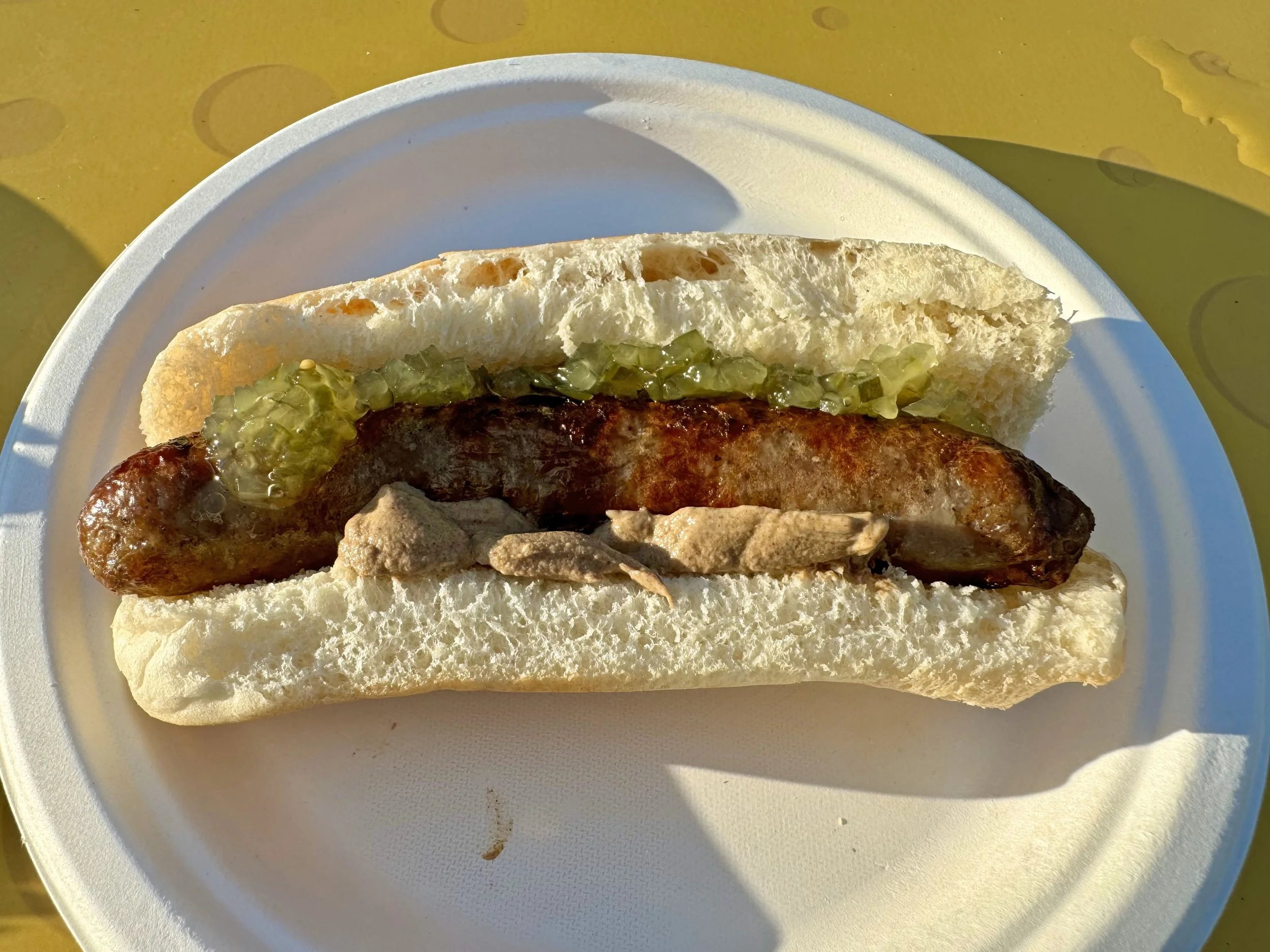 I had a look at the wonderfully decorated Wurst Weiner Mobile, offering brats, Chicago Dogs, chili cheese dogs, and create-your-own dogs. I ended up with the Specialty Brat of the night, a 12-pepper brat with sauerkraut, while Dad had the standard brat with Stadium mustard and relish.