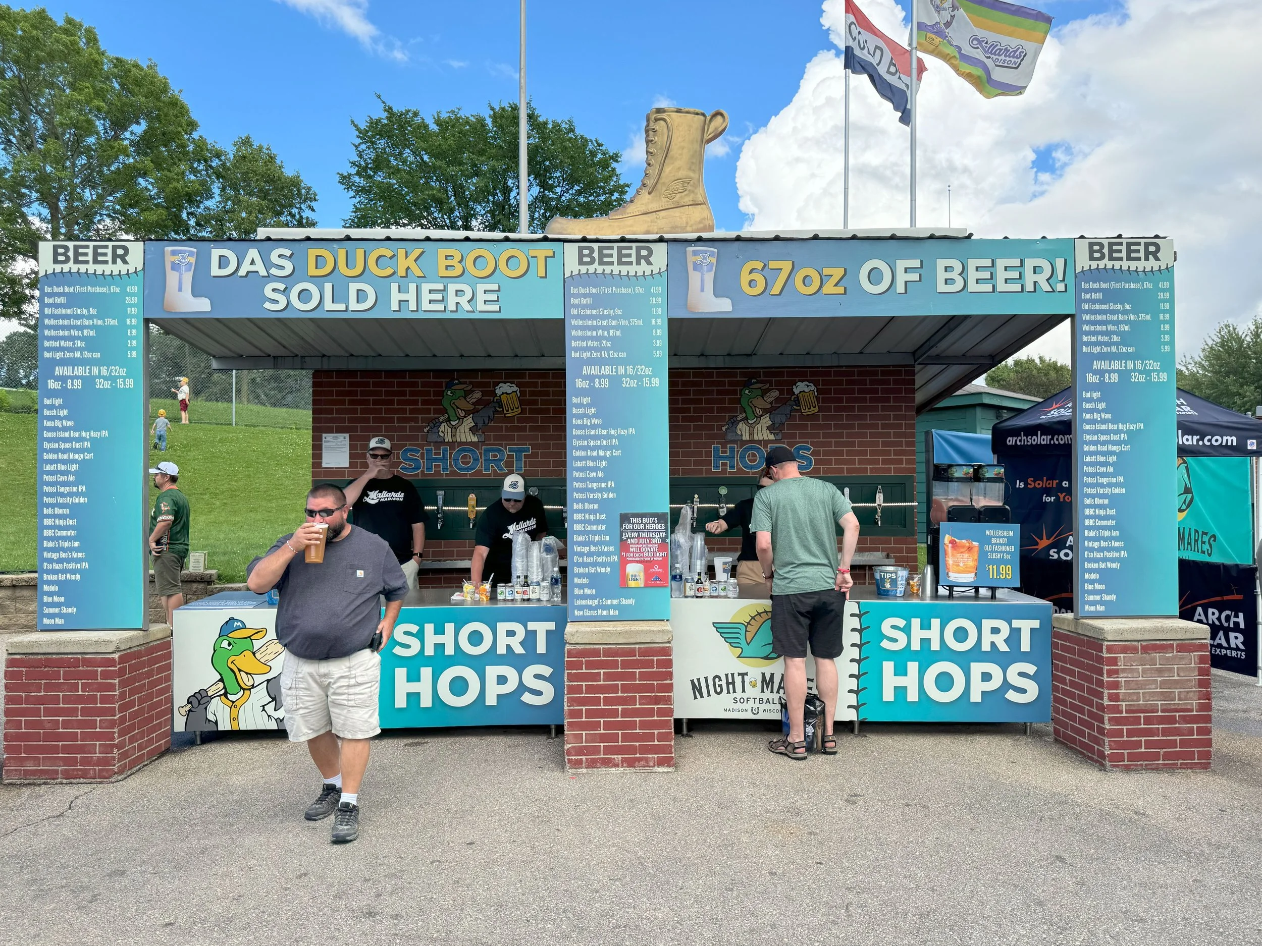 The ballpark had a truly impressive collection of beers — more than 20 in all, most of them on tap. Serving sizes went all the way up to the colossal Das Duck Boot, 67 ounces of your favorite brew served in a plastic boot.