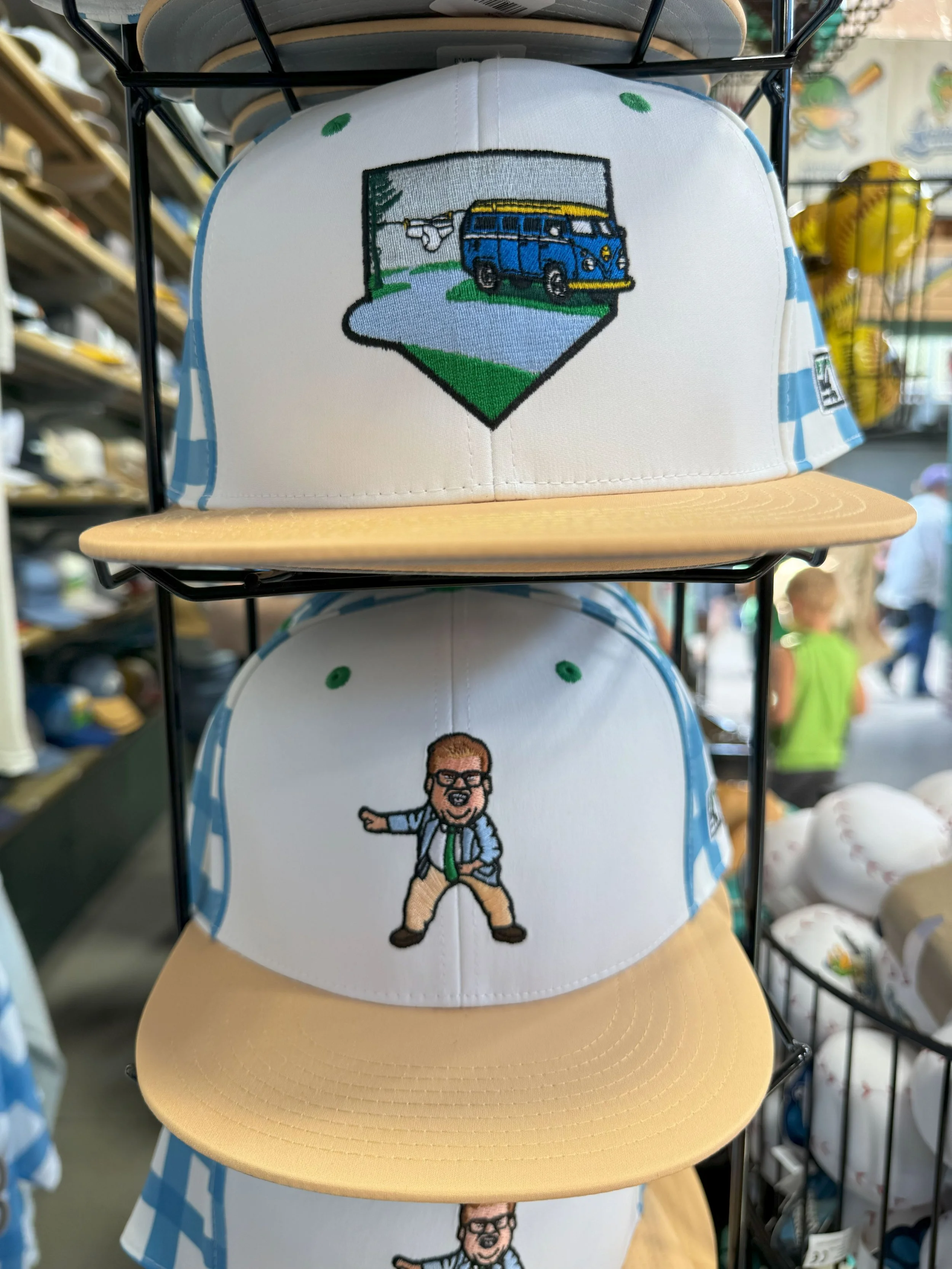 In 2024, Madison unleashed a foursome of alternate identities that shook the Internet, beginning with the “Motivational Speakers,” a tribute to Madison native and Saturday Night Live alumnus Chris Farley. His Matt Foley character is exquisitely depicted in a jersey resembling a tacky, disheveled suit. Hat options include a bellowing Foley and his “van down by the river.”