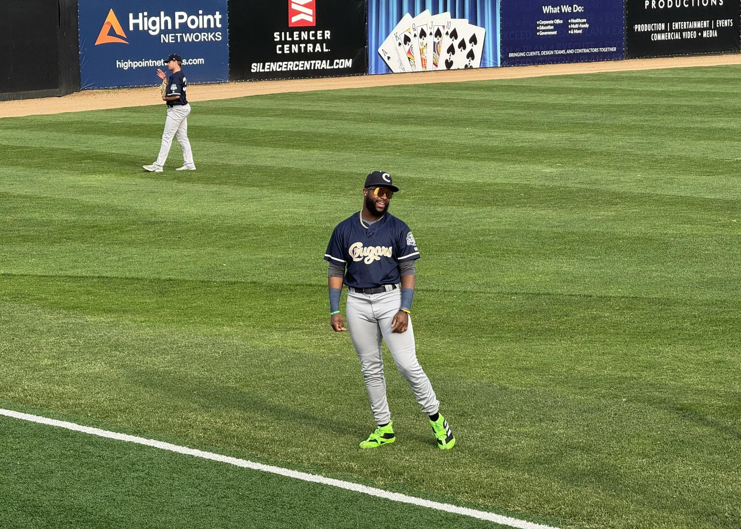 As I reached the outfield fence down the right-field line, a Cougars hitter laced a long foul ball over my head, and it bounced right to me for a nice souvenir.