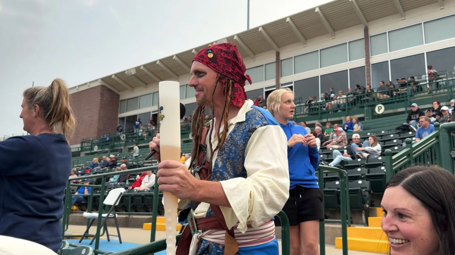We also looked on as a family was upgraded in a sponsored promotion from their upper-bowl seats to… the seats we were sitting in! We had moved one row back into what seemed like empty seats to get a better view over taller fans in front of us. Suddenly, all eyes were on us — the two vagabonds being asked to collect their things and move as a young couple with a baby waited patiently to receive their prize seats.