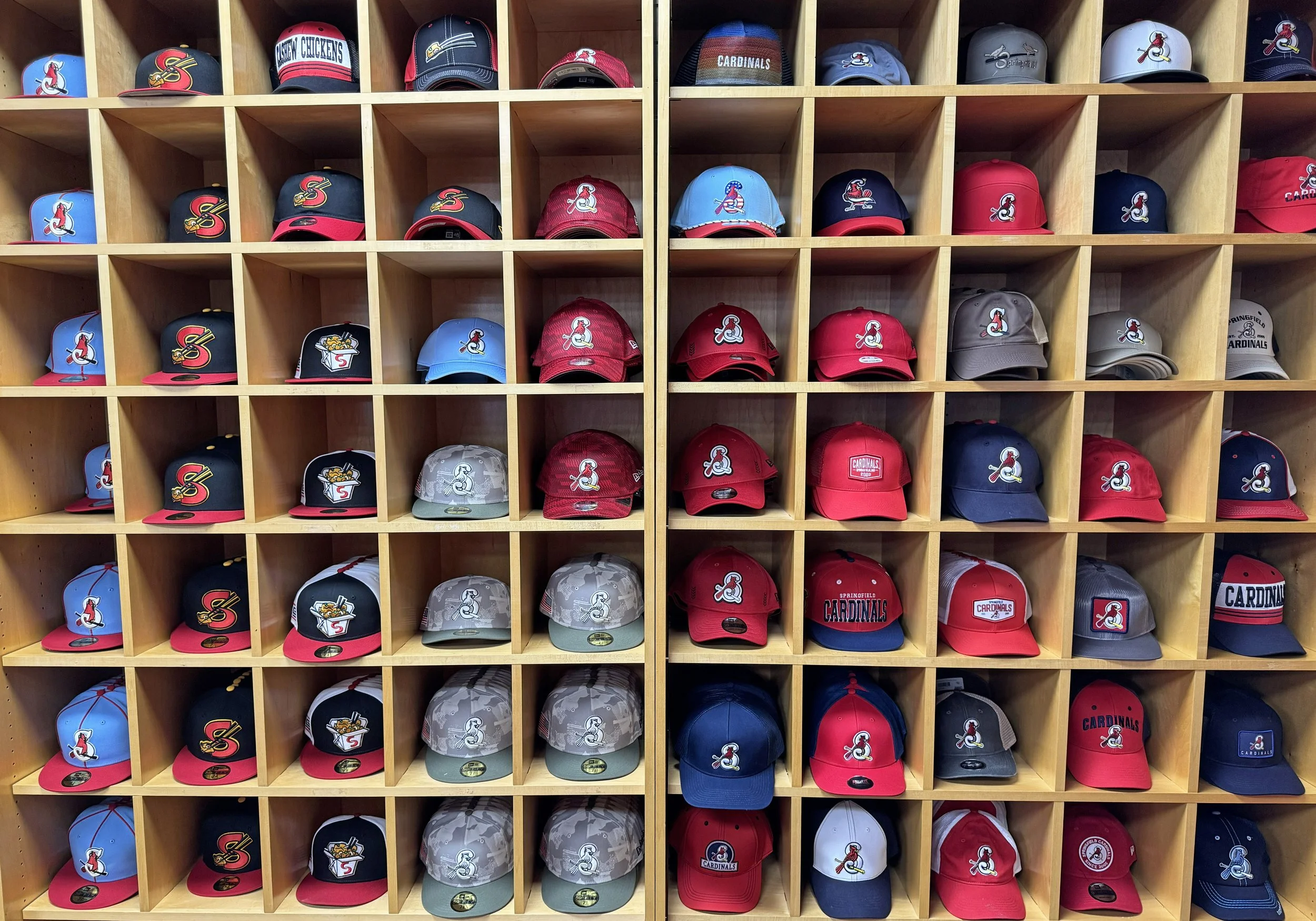 We found Springfield apparel and caps in Cardinals red, powder blue and “midnight navy blue,” plus options celebrating the team’s alternate identities, the Cashew Chickens and the Cardinales de Springfield — its Copa de la Diversión persona celebrating Latin culture.