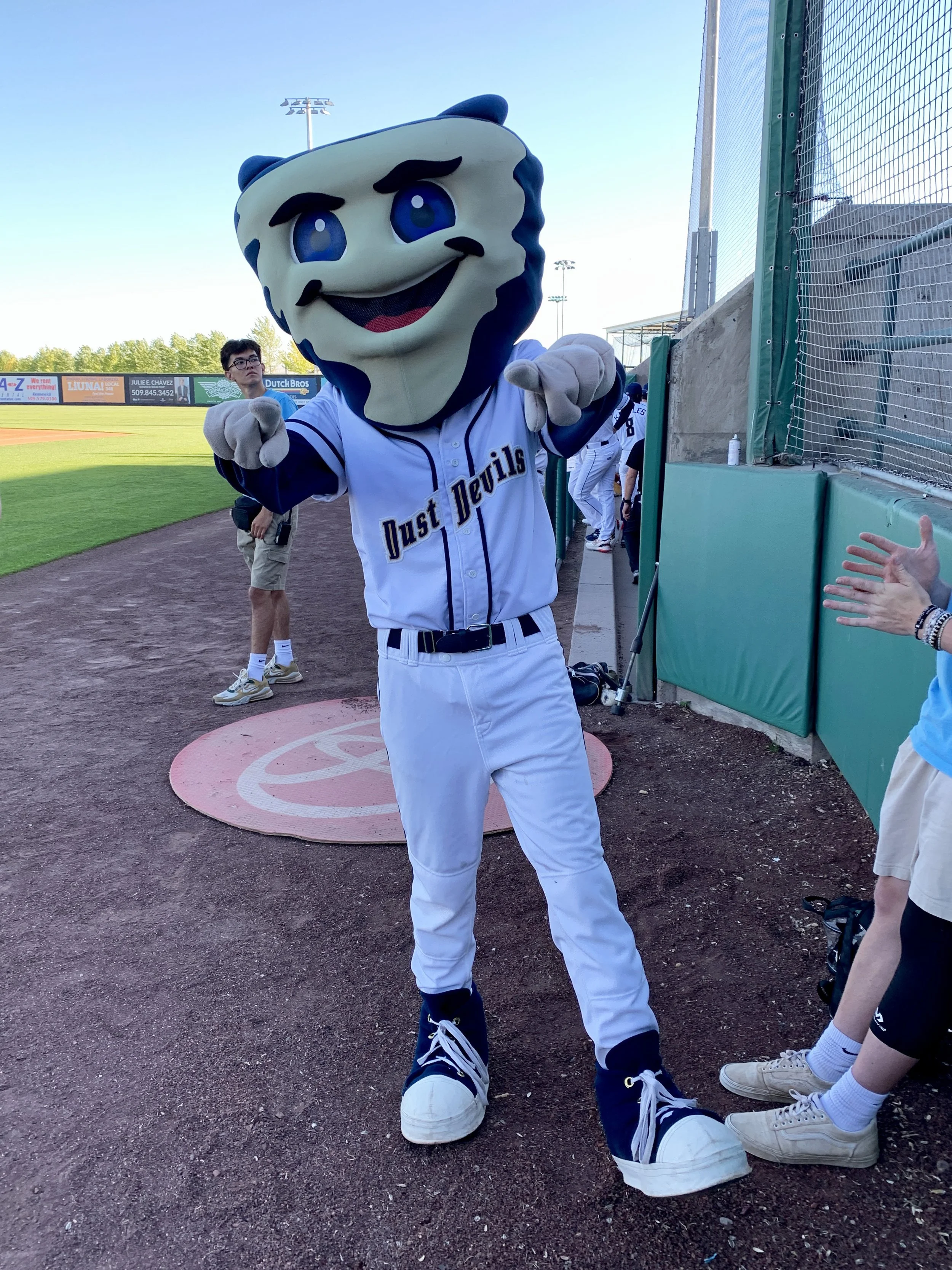 Our most anticipated game! Dad and I meet on-field host Erik “The Peanut Guy” Mertens at Gesa Stadium in Pasco, Washington, home of the Tri-City Dust Devils, the High-A affiliate of the Los Angeles Angels. Their opponent: the Hillsboro Hops. And it’s my first Minor League first pitch!